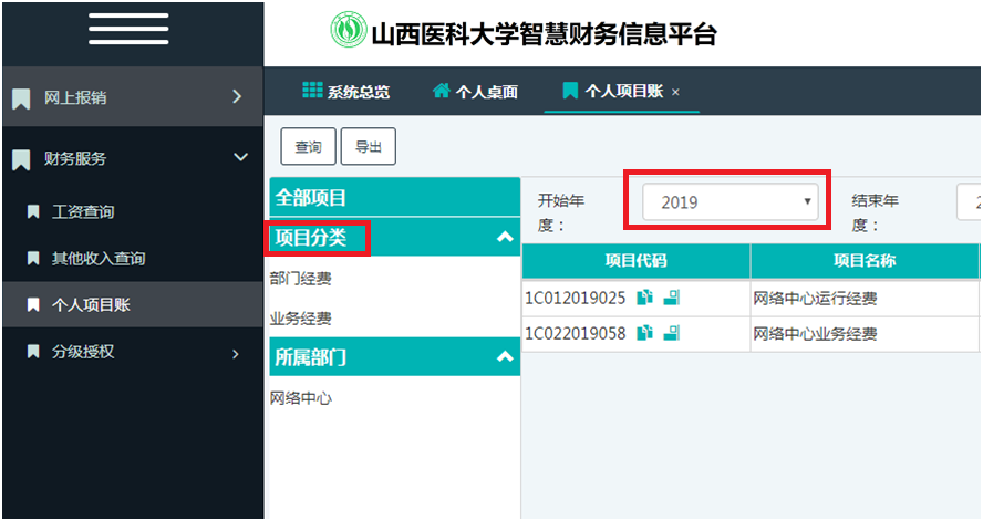 2、登陸后,頁面左側(cè)菜單欄點(diǎn)擊“財(cái)務(wù)服務(wù)”按鈕,下拉菜單選項(xiàng)中選擇“個(gè)人項(xiàng)目賬”,即可查詢。