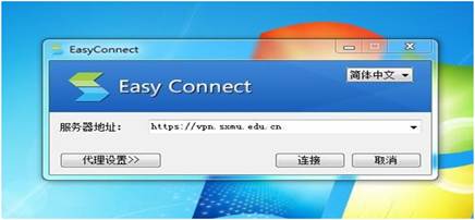 C、點(diǎn)擊桌面上的EasyConnect客戶端,服務(wù)器地址輸入:https://vpn.sxmu.edu.cn,點(diǎn)擊“鏈接”。界面如下: