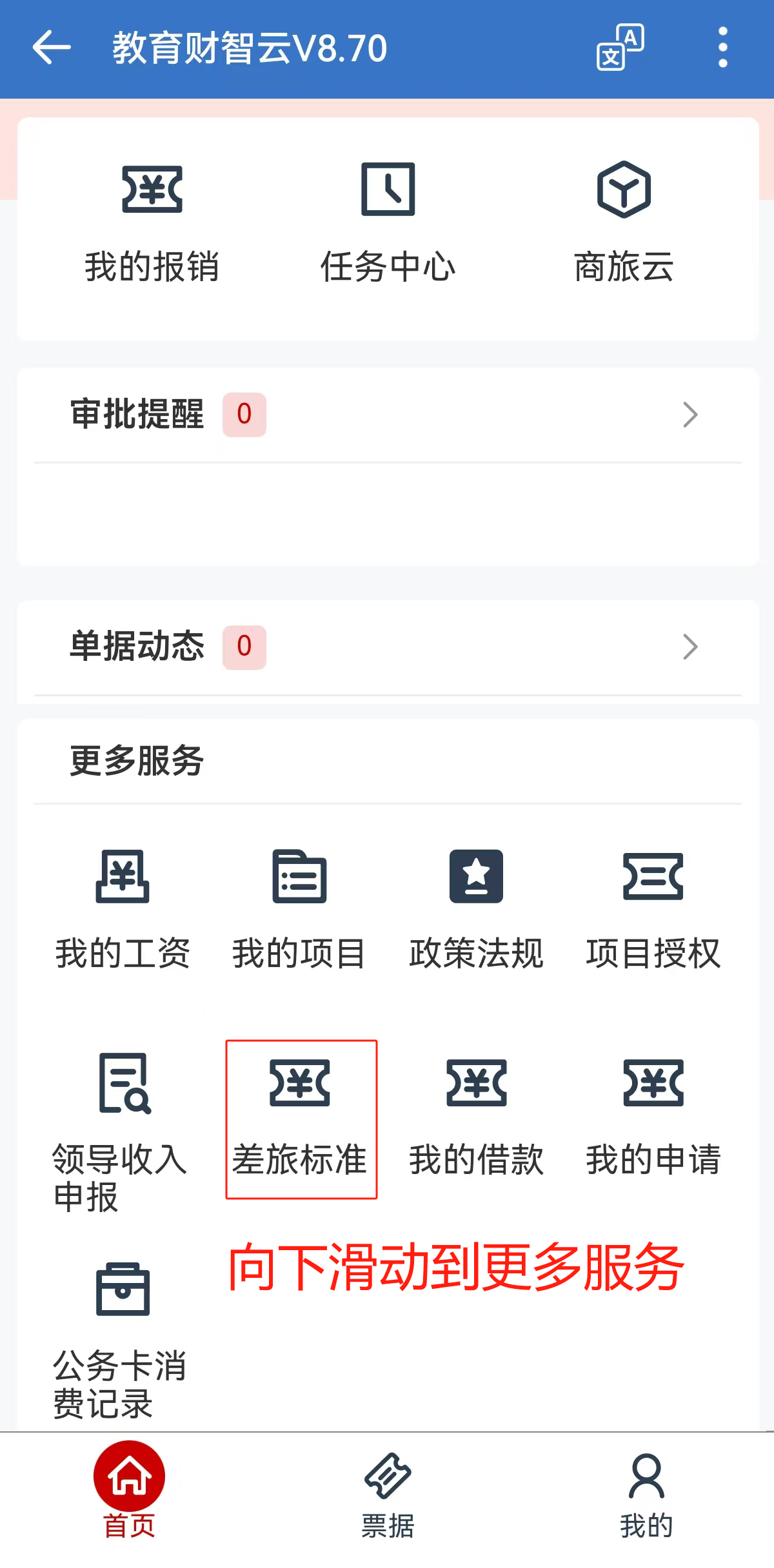 2.在財務系統中向下滑動到更多服務,點擊“差旅標準”。