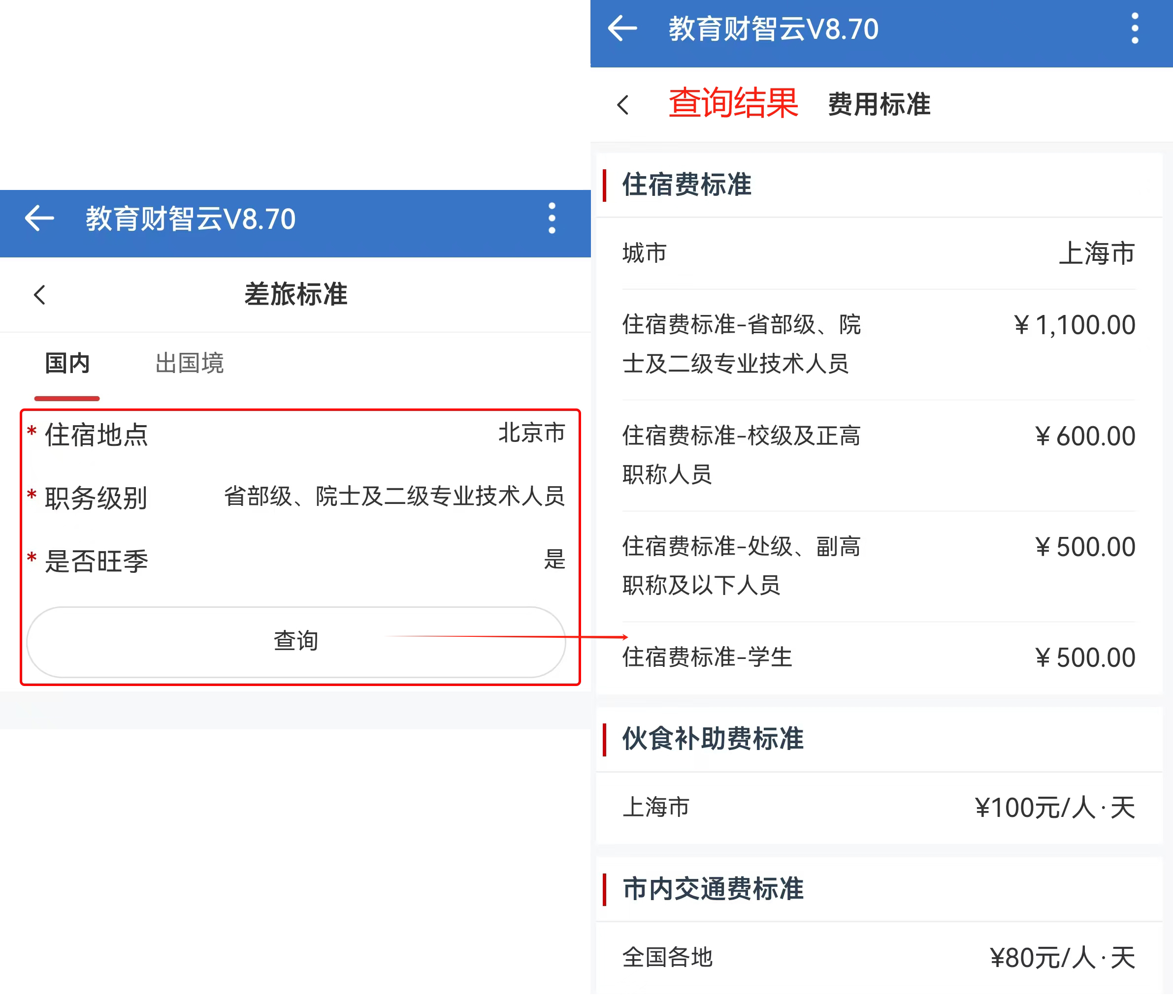 3.根據提示選擇住宿地點、職務級別、是否旺季,點擊查詢按鈕。