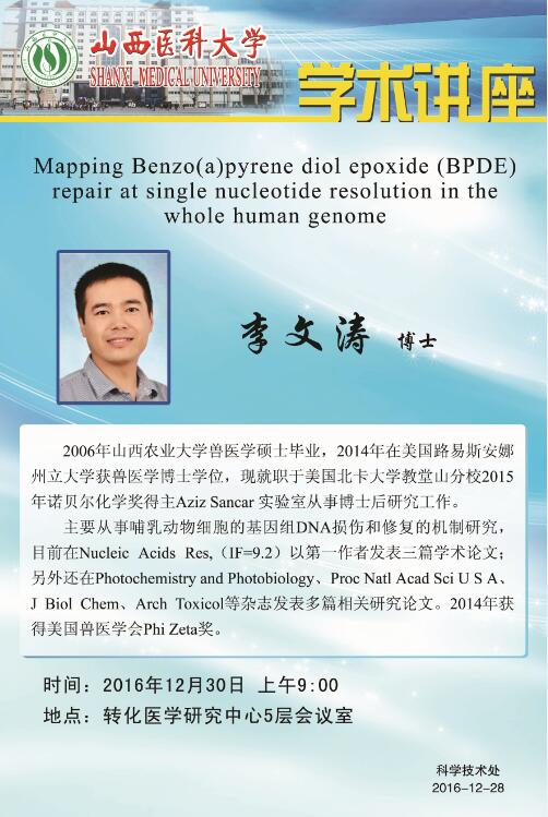 學術講座:Mapping Benzo(a)pyrene diol epoxide (BPDE) repair at single nucleotide resolution in the whole human genome