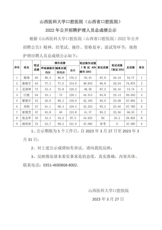 c7c7.app口腔醫院(山西省口腔醫院)2022年公開招聘護理人員總成績公示