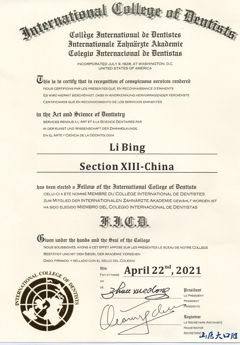 李冰教授作為我院的領軍人才,為山西口腔事業的發展作出了卓越貢獻。此次經山西省口腔醫學會推薦被評選為國際牙醫師學院院士,是近兩年內唯一的山西籍新晉院士,同時也是我院繼趙彬教授、任秀云教授、武秀萍教授之后又一位獲此殊榮的口腔醫學專家,為山西口腔贏得了榮耀。