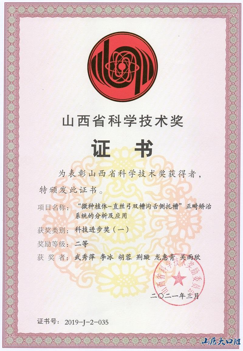 近日,山西省人民政府發(fā)布了《關(guān)于2019年度山西省科學(xué)技術(shù)獎勵的決定》,我院武秀萍教授團隊申報的“‘微種植體-直絲弓雙槽溝舌側(cè)托槽’正畸矯治系統(tǒng)的分析及應(yīng)用”項目喜獲山西省科技進步獎二等獎。