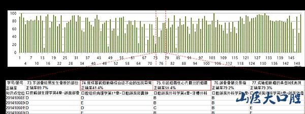 通過(guò)本次在線(xiàn)模擬考試,總結(jié)了2020年2月以來(lái),我院學(xué)生在線(xiàn)教學(xué)的階段性學(xué)習(xí)成果,檢驗(yàn)了本階段在線(xiàn)教學(xué)的效果。在試卷分析中,通過(guò)知識(shí)點(diǎn)得分率分析,教師授課章節(jié)得分對(duì)比,及各年級(jí)班級(jí)成績(jī)對(duì)比,總結(jié)本階段口腔教學(xué)工作中的盲點(diǎn),將結(jié)果反饋于代課教師和學(xué)生,進(jìn)一步加強(qiáng)教師課堂教學(xué)的針對(duì)性,提升學(xué)生對(duì)執(zhí)業(yè)醫(yī)師考試的復(fù)習(xí)效率。