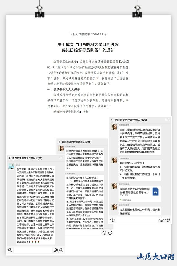 “院感防控”指的是醫(yī)院的感染預防與控制工作,是保障醫(yī)療質量和醫(yī)療安全、維護患者和醫(yī)務人員身體健康和生命安全的底線。這項工作,既需要各科室及部門根據(jù)醫(yī)院制定的相關制度完善和落實感控措施,同時也需要一支督導隊伍對落實情況進行檢查和指導。3月7日,根據(jù)山西省衛(wèi)健委發(fā)布的《關于印發(fā)山西省新型冠狀肺炎醫(yī)院防控督導員制度(試行)的通知》指示精神,我院正式成立了c7c7.app口腔醫(yī)院感染防控督導員隊伍。