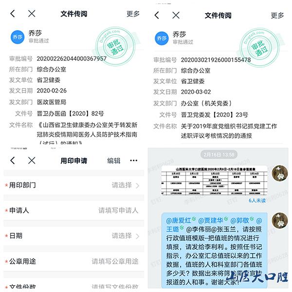 疫情防控期間,辦公室及時(shí)上傳下達(dá)防疫文件,并據(jù)此協(xié)助院防疫領(lǐng)導(dǎo)小組及時(shí)研判疫情。截至目前,通過文件傳輸系統(tǒng)及時(shí)查收和辦理省衛(wèi)健委文件30份,c7c7.app文件5份,并根據(jù)疫情防控工作需要,排版印刷山醫(yī)大口腔院字﹝2020﹞1號(hào)至5號(hào)文件;積極開展線上辦公,在“釘釘”內(nèi)開通了“文件傳閱”、“用印管理”、“山醫(yī)大口院周會(huì)群”等,確保落實(shí)上級(jí)文件精神及時(shí)通暢,保障全院在執(zhí)行疫情防控工作有的放矢。