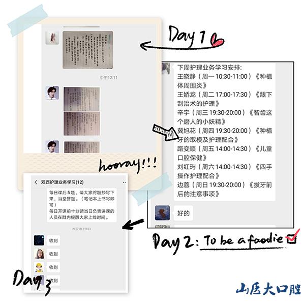 雙西護理在科主任和護士長的帶領下正在將微信直播的業務學習按計劃積極開展中,在幾次的直播學習過程中,“人人當老師,人人當學生”,課前大家積極認真準備授課課件,布置良好的授課環境,保證授課順利進行;課中認真做好筆記,及時交流疑點難點;課后按時完成授課作業,及時強化了課上學習內容。此次學習內容豐富廣泛,涉及口腔內科,口腔頜面外科,種植科,兒童保健等多種學科,學習深度也較之前有所提升。通過此次創新性微信直播學習,極大的調動了大家學習的主動性與積極性。