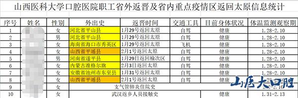 為了積極貫徹落實上級有關部門精神和醫(yī)院疫情防控工作部署,院感科第一時間收集掌握了醫(yī)院所有職工及規(guī)培學生的基本信息,尤其是在疫情初期迅速對春節(jié)期間院內(nèi)職工外出離晉的情況進行統(tǒng)計,統(tǒng)計內(nèi)容包括外出時間、外出地點、出行方式、離返晉時間等,力爭內(nèi)容詳實、完整。加強對重點人群信息的掌握,篩查職工中三類重點人群(湖北返者、重點疫區(qū)返者、省內(nèi)重點疫區(qū)未返回者)并進行實時健康監(jiān)測信息上報。為進一步掌握職工健康動態(tài),利用釘釘系統(tǒng)員工健康的功能進行每日健康信息收集匯總。同時為減少人員流動,防止疫情蔓延,按照醫(yī)院疫情防控工作組的部署發(fā)出職工暫緩返程的公告,穩(wěn)妥有序推進各項工作開展。