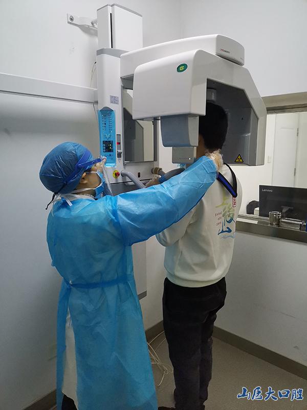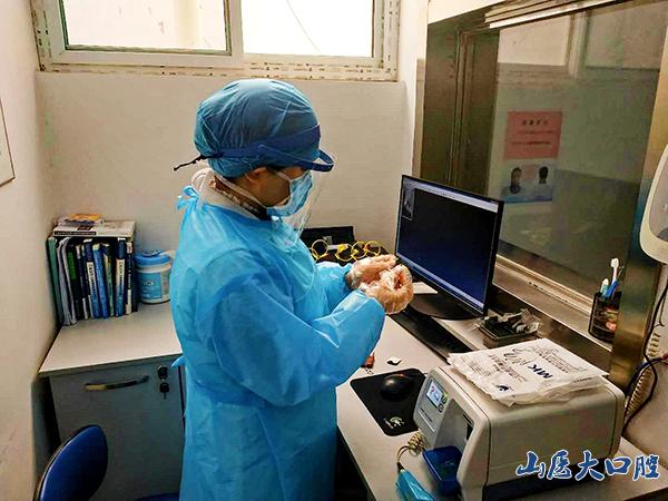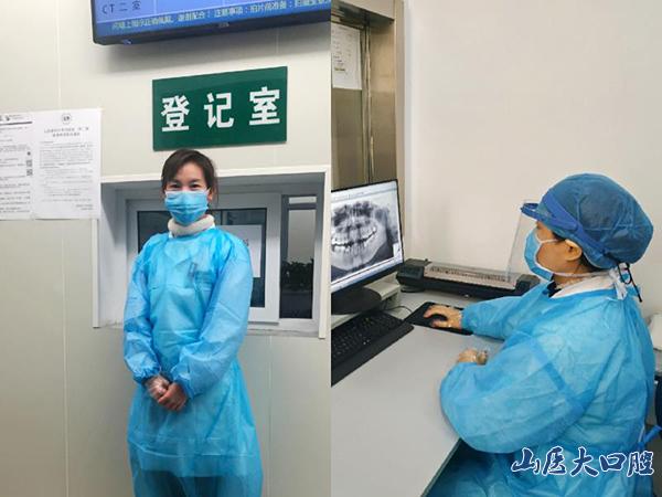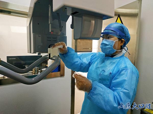 在疫情防控期間,口腔診療和拍片不僅要與患者近距離接觸,還可能直接接觸患者的唾液,在強大的考驗面前,影像科技師精準的擺位、投照、掃描嫻熟而從容。