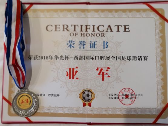 為了弘揚(yáng)體育精神,提高口腔行業(yè)從業(yè)人員的身體素質(zhì),4月24日---27日,我學(xué)院(醫(yī)院)受邀參加了由四川省醫(yī)學(xué)會主辦,華光口腔器材(集團(tuán))有限公司承辦,西部國際口腔展組委會協(xié)辦的“華光杯”2018西部國際口腔展全國足球邀請賽,并斬獲本次比賽亞軍。