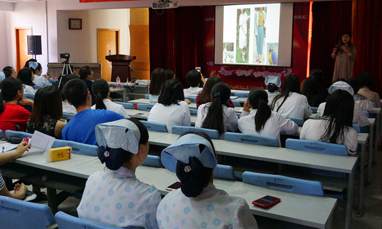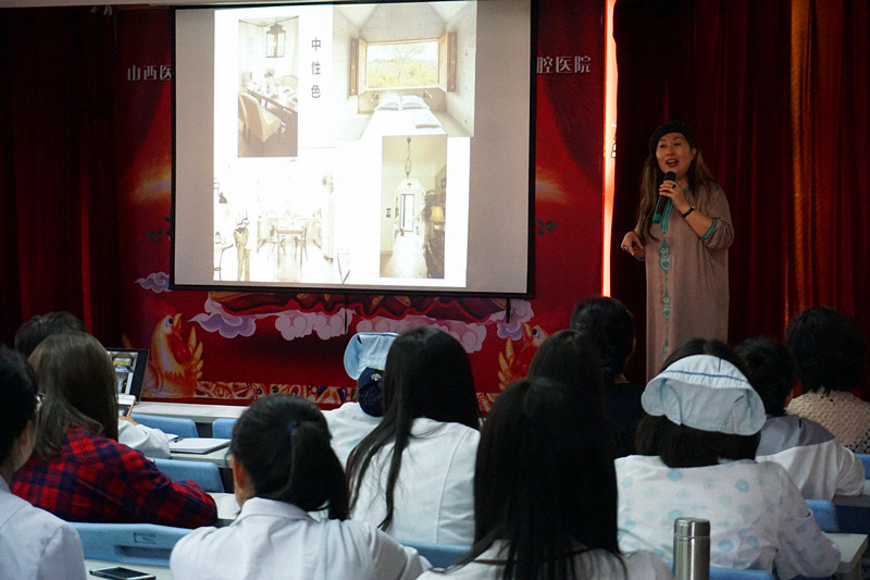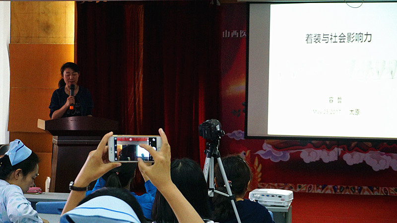 容女士針對醫(yī)護(hù)和教師職業(yè)的特性,以圖文并茂的形式著重講解了色彩搭配的原則,以及在不同的職業(yè)場合中的得體著裝、色彩搭配及飾物點(diǎn)綴等職業(yè)女性應(yīng)掌握的著裝技巧。容女士邊講解邊示范,現(xiàn)場點(diǎn)評、與現(xiàn)場人員互動指導(dǎo)著裝,詼諧幽默語言,輕松活潑的氛圍贏得了大家的一致好評和掌聲陣陣。