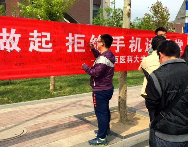 活動之初,口腔醫學系學生會主席謝晶偉向全體同學宣讀了倡議書,倡導大家從自我做起,拒絕手機進入課堂。隨后以自編短劇和漫畫的形式向全體同學發起倡議,倡導大家合理使用手機,文明上課。自編自導自演的正反兩組情景短劇讓同學們深刻體會到文明不僅是個人修養的體現,更是對他人的禮貌和尊重。漫畫則向大家展示了生活中的“低頭族”、“插隊黨”、“后排癥”等一些不文明的現象。搞笑夸張的劇情和圖片不僅僅引人發笑,更給大家帶來了深思,文明就體現在我們身邊的點滴小事中。儀式的最后,全體同學在“拒絕手機進入課堂”的大型條幅上鄭重地簽下了自己的名字。