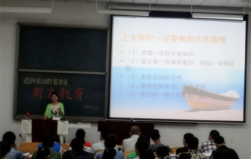 首先,由口腔醫學系(院)任秀云副院長為2014級新生做了細致的專業介紹,幫助新生盡快認識所學專業的特點和情況;隨后,口腔系(院)黨總支殷鳳副書記從目標、習慣、心態、交往、安全等方面以實例進行了針對性的講解和詮釋,其中,著重對學生可能會遇到的學業問題、人際交往、安全隱患進行了分析,幫助新生從源頭上解決今后可能遇到問題。最后,殷老師提出了10條中肯的建議以便幫助同學們更好地適應大學生活,營造良好的寢室氛圍,安全愉快的度過五年大學生活。