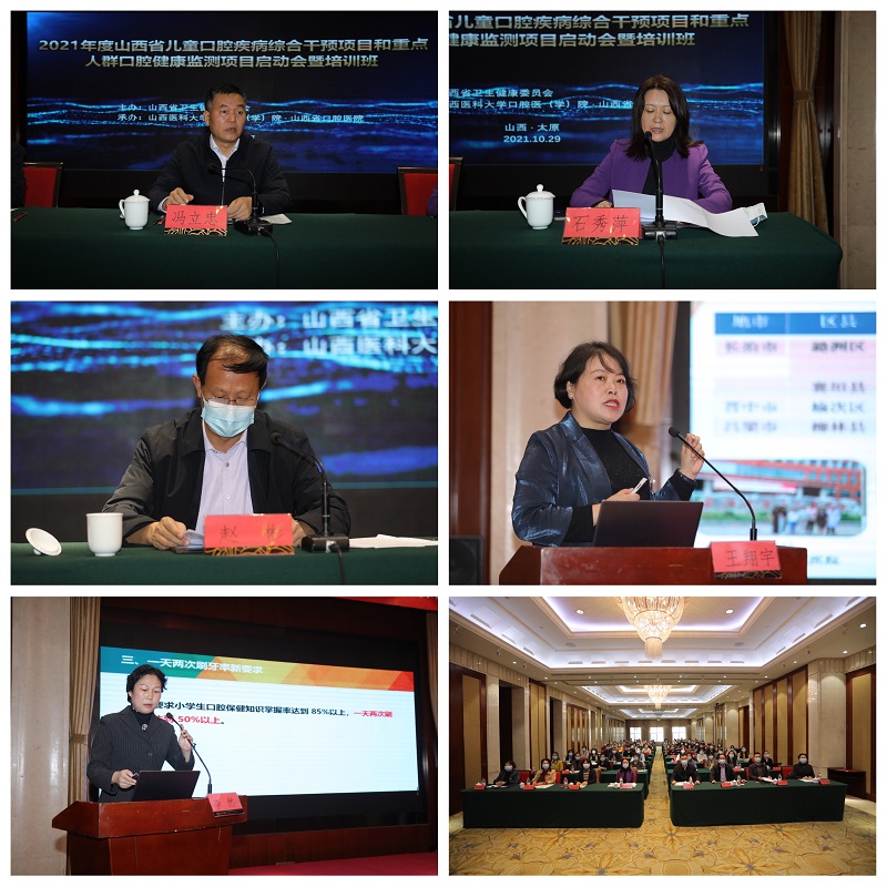 2021年10月29日上午,由山西省衛生健康委主辦、我院承辦的“2021年度山西省兒童口腔疾病綜合干預項目和重點人群口腔健康監測項目啟動會暨培訓班”在太原市并州飯店隆重舉行。山西省衛健委副主任、一級巡視員,省疾控中心主任馮立忠、山西省衛生健康委疾控處處長石秀萍、我院院長趙彬、副院長王翔宇出席會議。省級項目領導組、項目辦公室和技術指導組的專家,各市衛生健康委疾控科長、項目辦負責人、技術組組長,承擔重點人群口腔健康監測項目的市縣兩級衛生健康、疾控中心、醫療機構的相關負責同志和專業技術人員等共95人參加會議。