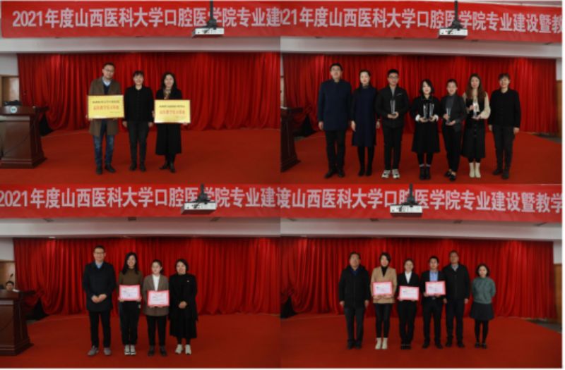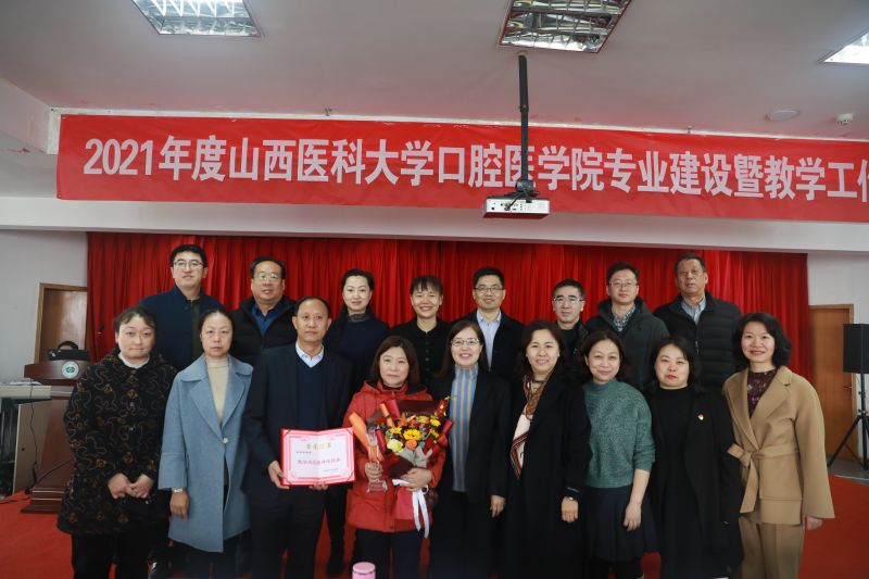 在激動熱烈的氛圍中,口腔醫學院黨委書記任秀云宣讀了《關于表彰2021年度教學工作先進集體和先進個人的決定》,對優秀本科教學實習基地、優秀課程建設團隊、專業及學科建設團隊和取得優秀教學成果的團體及個人表示:兀歡暈萄ё齔鐾懷齬畢撞⒅傅、引領青年教師的孫克勤教授頒發“教學風范終身成就獎”,由校院兩級領導共同為其頒獎并合影留念。