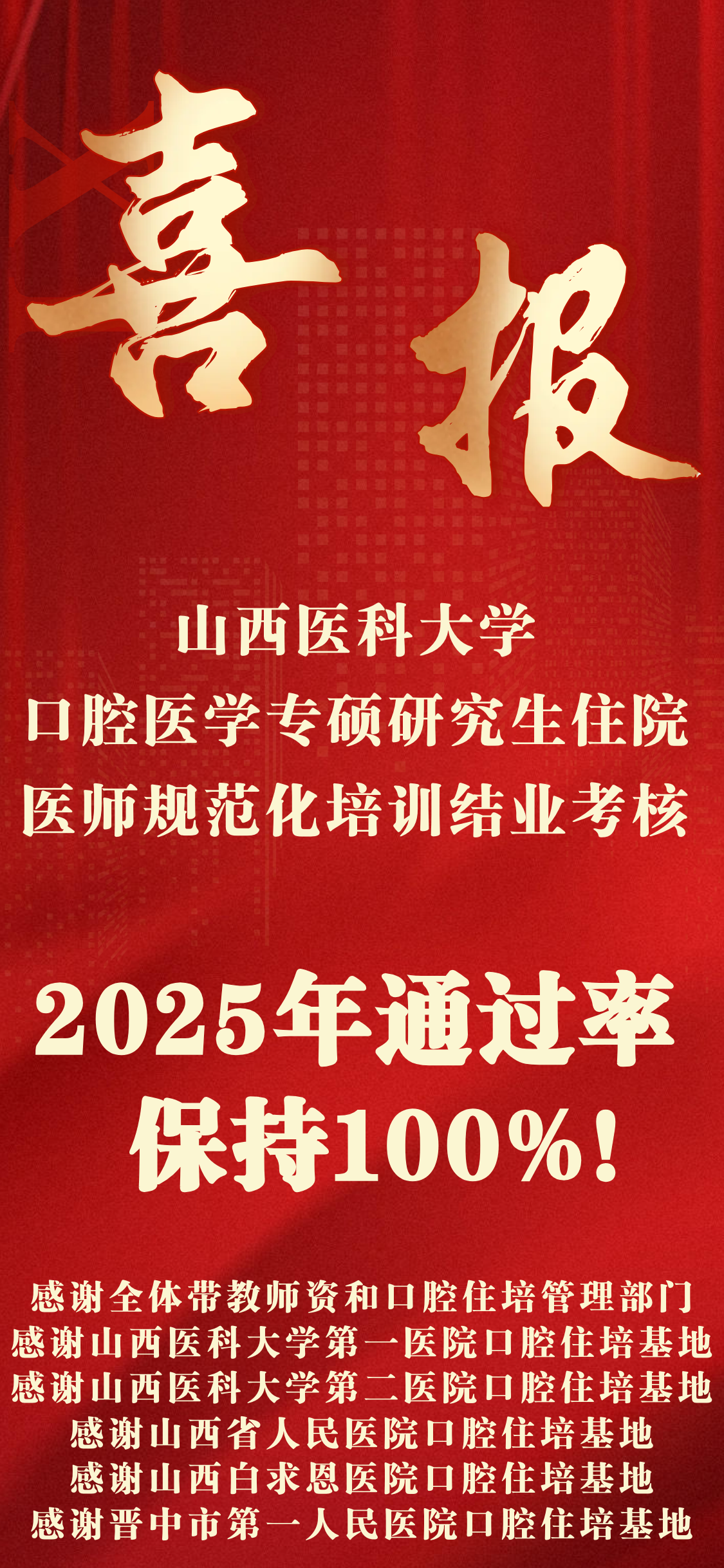 住院醫師規范化培訓是培養合格臨床醫師的必經之路,結業考核則是檢驗培訓質量的“試金石”和醫師執業生涯的“通行證”。本次全員通過住院醫師規范化培訓結業考核,標志著我院在住院醫師規范化培訓道路上樹立了一座重要的里程碑。這不僅是全體規培學員勤學苦練、奮力拼搏的成果,更是所有的帶教老師及所在口腔專業規培基地高度重視與辛勤付出的碩果,感謝c7c7.app第一醫院口腔住培基地、c7c7.app第二醫院口腔住培基地、山西省人民醫院口腔住培基地、山西白求恩醫院口腔住培基地、晉中市第一人民醫院口腔住培基地對所有口腔醫學專碩并軌規培生的培養和幫助。