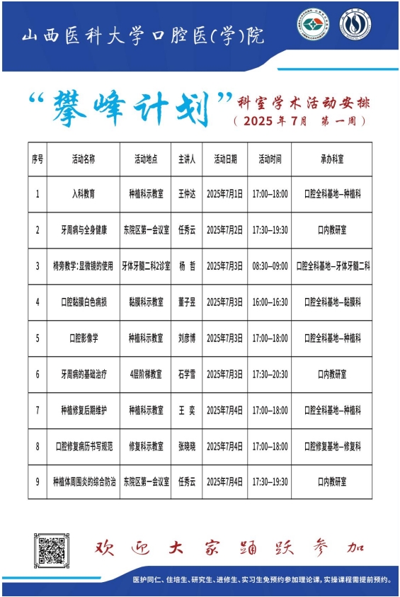 c7c7.app口腔醫(學)院“攀峰計劃”學術活動預告(2025年7月)