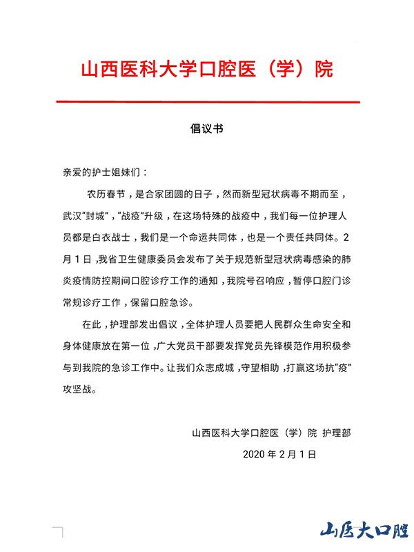 在實(shí)際工作中,王君同志深知當(dāng)先鋒、作表率的重要性,深明抗“疫”任務(wù)的嚴(yán)峻性,在明知疫情形式不夠明朗的情況下,仍然主動(dòng)請(qǐng)纓配合葛學(xué)軍副院長(zhǎng)外出社區(qū)給老人治療,無(wú)畏危險(xiǎn),是團(tuán)隊(duì)的旗幟!上行下效,2月1日我院緊急下發(fā)戰(zhàn)“疫”倡議書(shū),全員護(hù)理人員主動(dòng)請(qǐng)纓投身防控疫情第一線,希望與國(guó)家與武漢與我院共度難關(guān)。同舟共濟(jì),共赴危難,這就是團(tuán)隊(duì)的魅力!