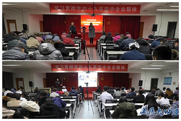 12月12日、18日下午,我院邀請山西省委黨校、山西行政學院劉樹信教授,以“認真學習貫徹十九屆四中全會精神 把制度優勢轉化為治理效能”為題,為我院講授了兩堂精彩的專題黨課。我院領導班子成員、全體教工黨員、重點發展對象、積極分子、中層干部、副高級職稱及以上人員、博士學位人員、研究生黨員100余人參加活動,院黨委書記任秀云主持。