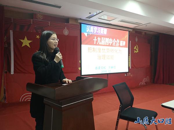 劉教授首先從“社會治安權的‘外包’、國務院公布環保熱線、政府購買公共服務”等五個生動典型的案例,展開了對行政管理體制改革、政府提升社會治理能力的分析與思考。接著,分析了提出“堅持和完善中國特色社會主義制度、推進國家治理體系和治理能力現代化”的歷史背景和原因。隨后,從結構和內容上詳細論述了十九屆四中全會審議通過的《中共中央關于堅持和完善中國特色社會主義制度、推進國家治理體系和治理能力現代化若干重大問題的決定》。劉教授將5000余字的全會公報歸納總結為1個重要判斷、3項重要結論、13個優勢、3步目標、10個新等內容。最后分析探討了堅持和完善中國特色社會主義制度、推進國家治理體系和治理能力現代化的形成過程及貢獻推進全球治理的中國智慧與方案。他多次引用了毛澤東“喚起工農千百萬,同心干”的詩詞,強調了在國際局勢的風云變幻、中國發展面臨內憂外患的情況下,要打贏防范化解重大風險攻堅戰,必須堅持和完善中國特色社會主義制度、推進國家治理體系和治理能力現代化,運用制度威力應對風險挑戰,這充分激勵了全體黨員干部的愛國主義熱情和“為中華民族謀復興”的使命感。最后,任秀云書記和劉教授帶領大家對公報中的內容做了互動問答,再次強調了建設人人有責、人人盡責、人人享有的社會治理共同體的重要意義。全體黨員干部積極參與、踴躍搶答,充分展現了我院黨員干部良好的政治理論素養。