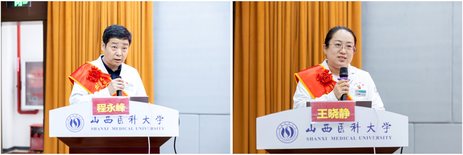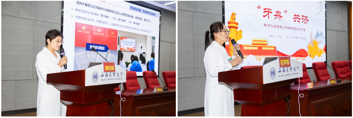 優秀共產黨員代表、口外科黨支部書記程永峰和優秀黨務工作者代表、后勤黨支部書記王曉靜作了交流發言;先進基層黨支部代表、口腔全科黨支部和牙體牙髓一科黨支部分別就各自支部的黨建品牌創建工作進行了精彩分享。