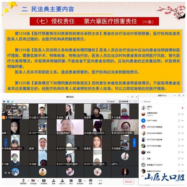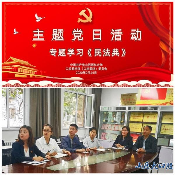 9月24日下午,我院在科教樓第一會議室開展主題黨日活動,專題學習《中華人民共和國民法典》。趙彬院長、教工支部書記、黨委辦公室人員線下參會,全體教工和學生黨員通過“騰訊會議”手機端、電腦端線上收看,實現了“線上+線下”共同學習,會議由黨委書記任秀云主持。