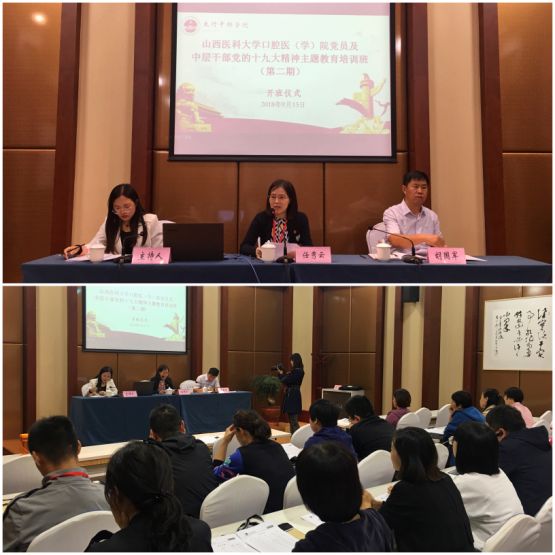 在培訓班開班儀式上,太行干部學院胡國軍副院長致歡迎辭。他向學員們詳細解釋了習近平總書記視察山西時提出的“四個始終保持”重要指示,希望學員通過培訓錘煉堅強黨性、堅定理想信念、踐行太行精神。隨后,我院黨委書記任秀云作動員講話并對學員提出三點要求,一要提高政治覺悟,切實增強政治素養、理論素養和黨性修養。二要端正學習態度,增強學習的主動性,做到學有所思、學有所悟、學有所獲。三要立足本職崗位,真正把學到的知識轉化為狠抓落實、推動工作的強大動力,為實現學校“建設成為特色鮮明的高水平研究教學型醫科大學”和口腔醫院“建設成為區域高水平、特色鮮明的三級甲等口腔專科醫院”的戰略目標貢獻力量。