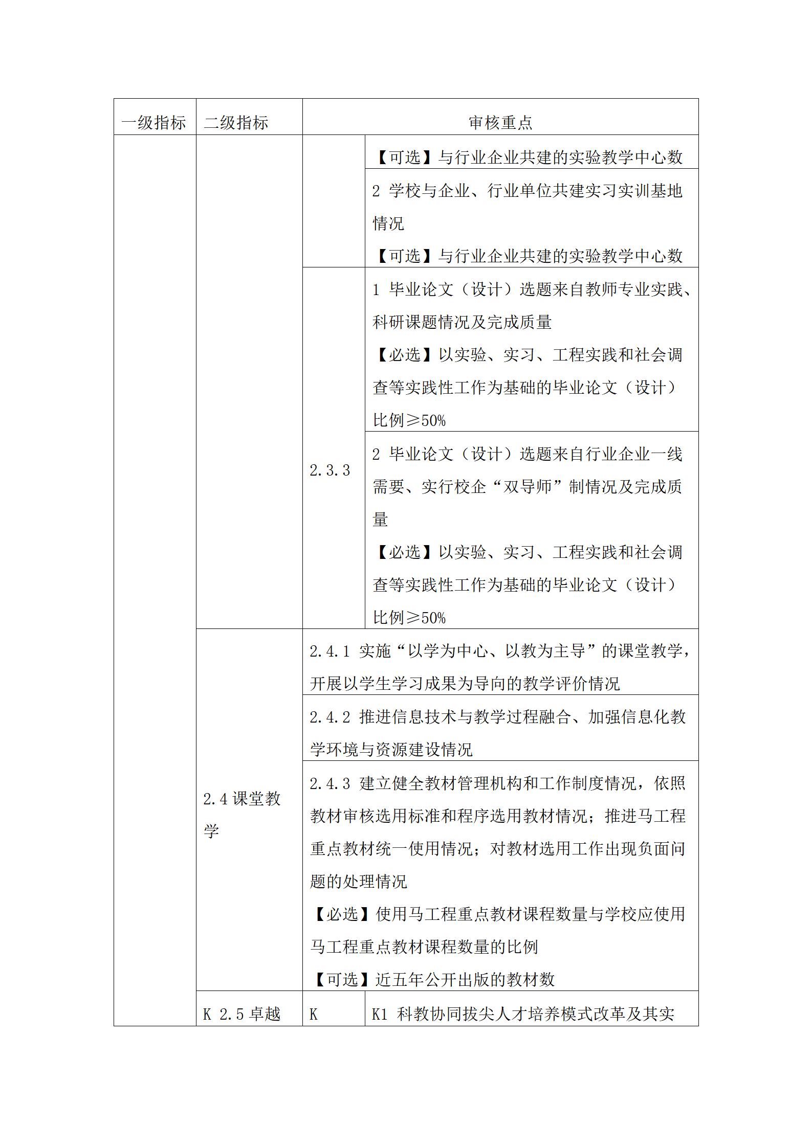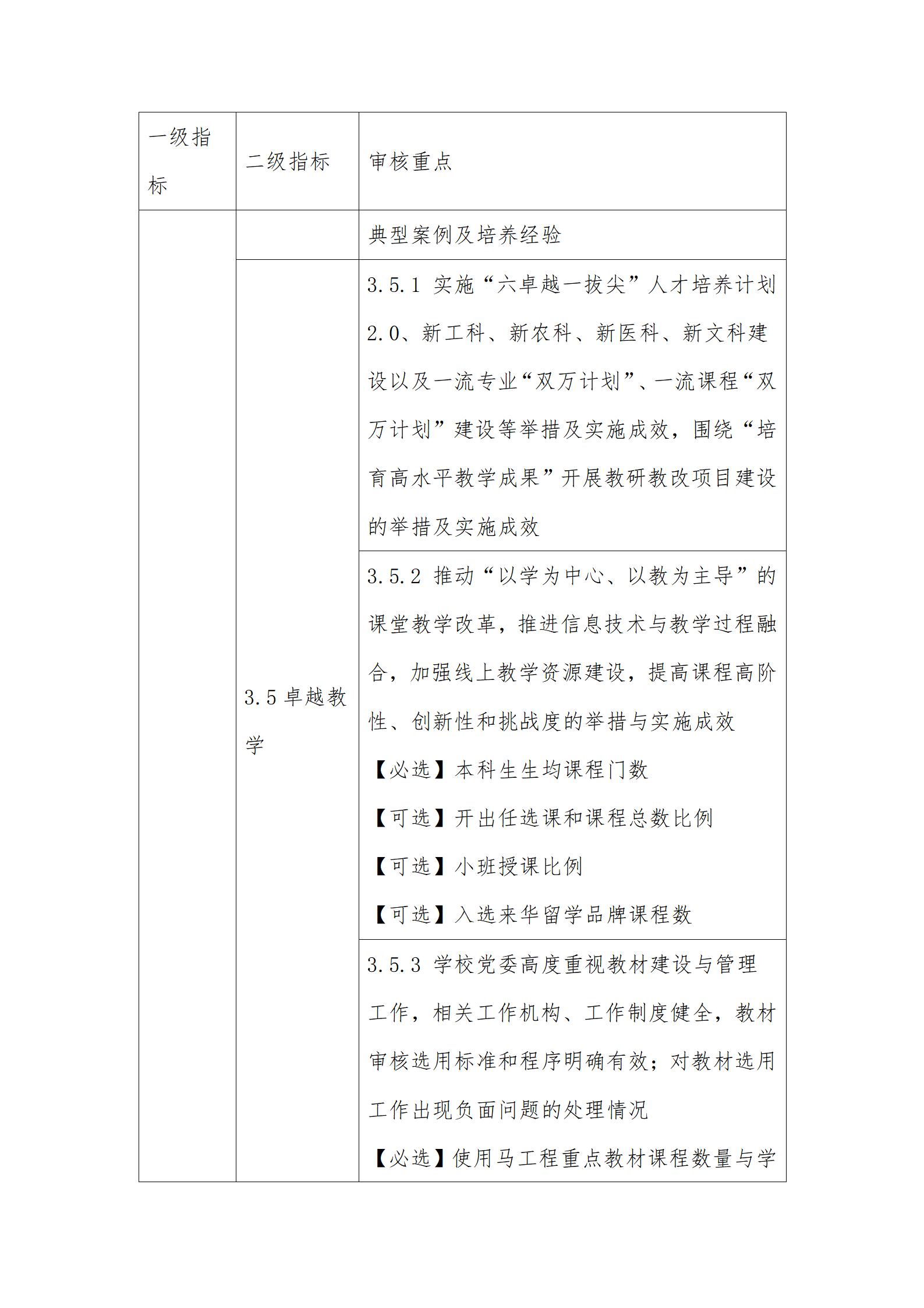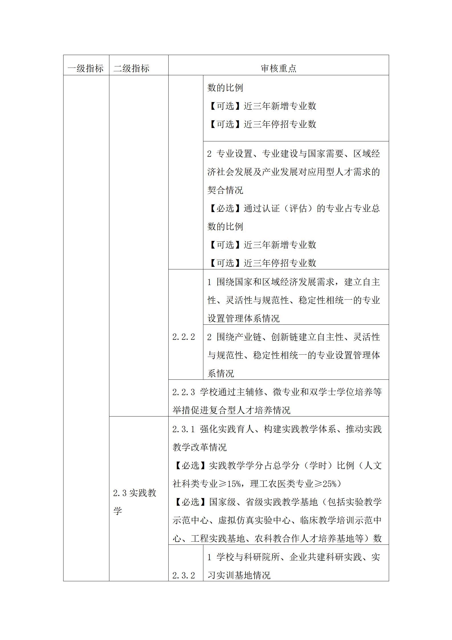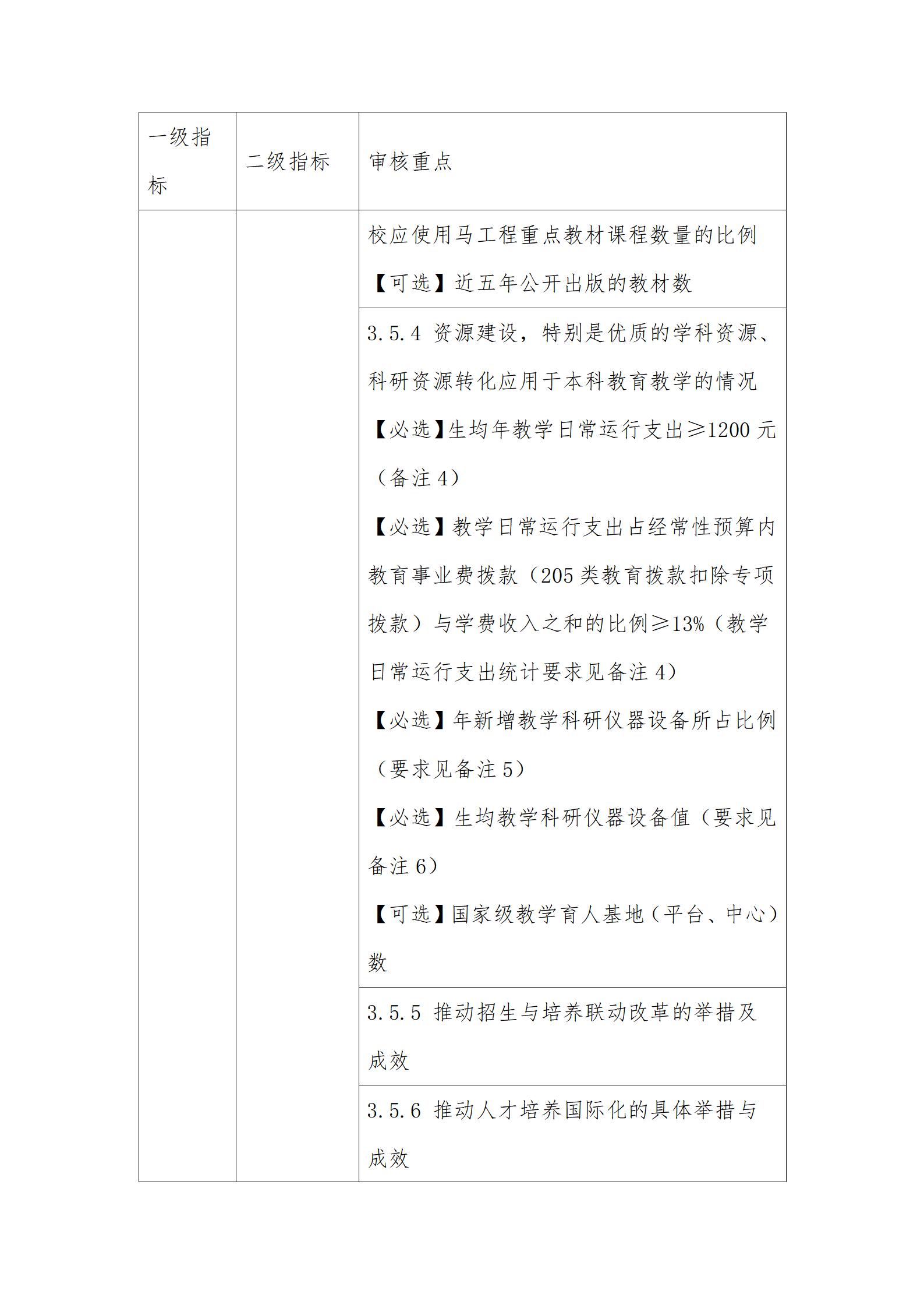1. 審核重點中定量指標的具體要求可參考國家相關標準。其中,【必選】是指該定量指標學校必須選擇;【可選】是指該定量指標學?山岷習煅導屎陀攀鋪厴,從高等教育質量監測國家數據平臺提供的教學基本狀態常態監測數據中自主選擇,進行等量或超量替換。
