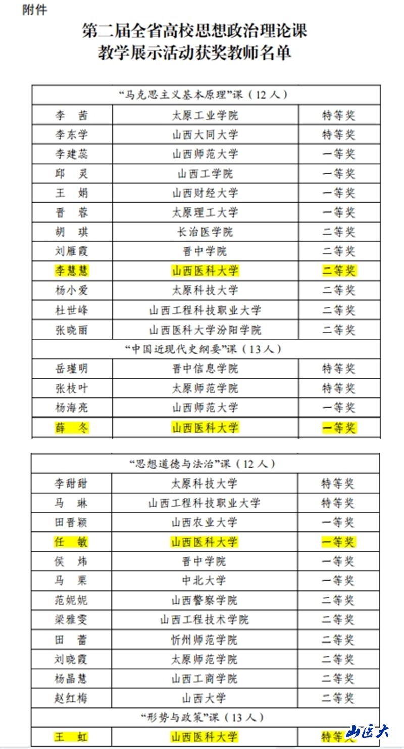 近日,山西省教育廳公布第二屆全省高校思想政治理論課教學展示活動獲獎教師名單,我校馬克思主義學院教師王虹榮獲本科組“形勢與政策”課特等獎,薛冬榮獲本科組“中國近代史綱要”課一等獎,任敏榮獲本科組“思想道德與法治”課一等獎,李慧慧獲本科組“馬克思主義基本原理”課二等獎。