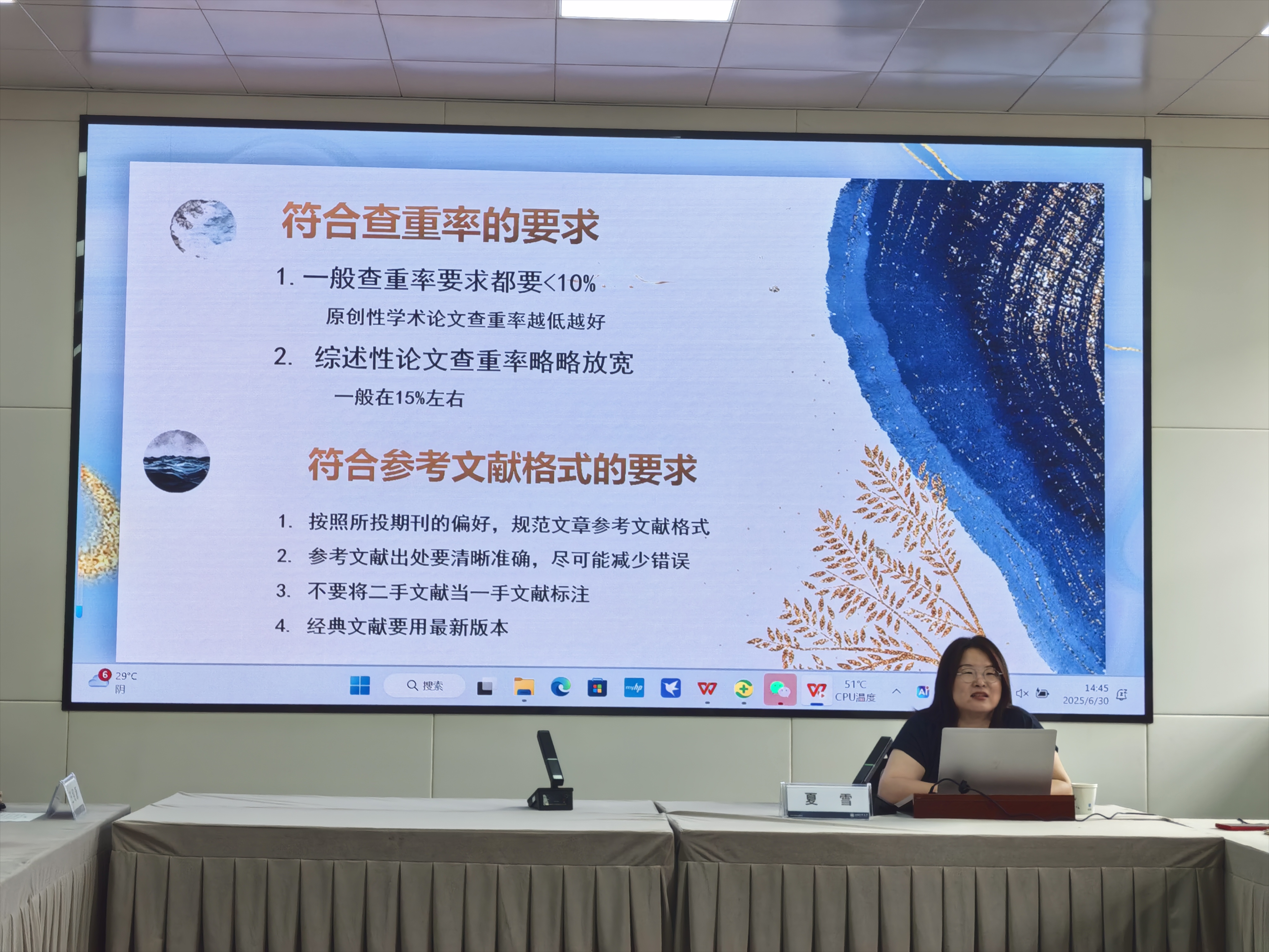夏雪以其豐富的編輯經驗和獨到的學術見解,深入淺出地剖析了社科類論文寫作的關鍵要素。她強調了選題的重要性,指出選題的創新性、實用性和可行性是論文成功的關鍵,一個好的選題應兼具學術價值與實踐意義,能夠引發學界與實踐領域的廣泛關注。她建議大家在廣泛閱讀的基礎上,應結合個人研究興趣和學術前沿動態,發掘獨特的研究視角。隨后,夏雪圍繞論文框架架構,詳細講解了引言、文獻綜述、研究方法、結論的撰寫方法。在投稿策略方面,夏老師為大家分析了不同期刊的審稿流程、審稿偏好以及投稿注意事項,并鼓勵大家要勇于嘗試,積極向高質量期刊投稿,同時也要注重論文的修改與完善,不斷提升自己的學術水平。