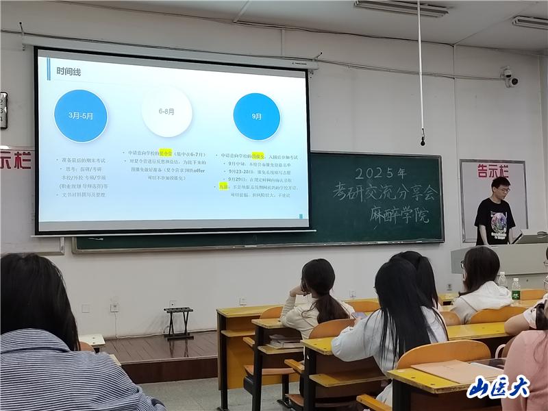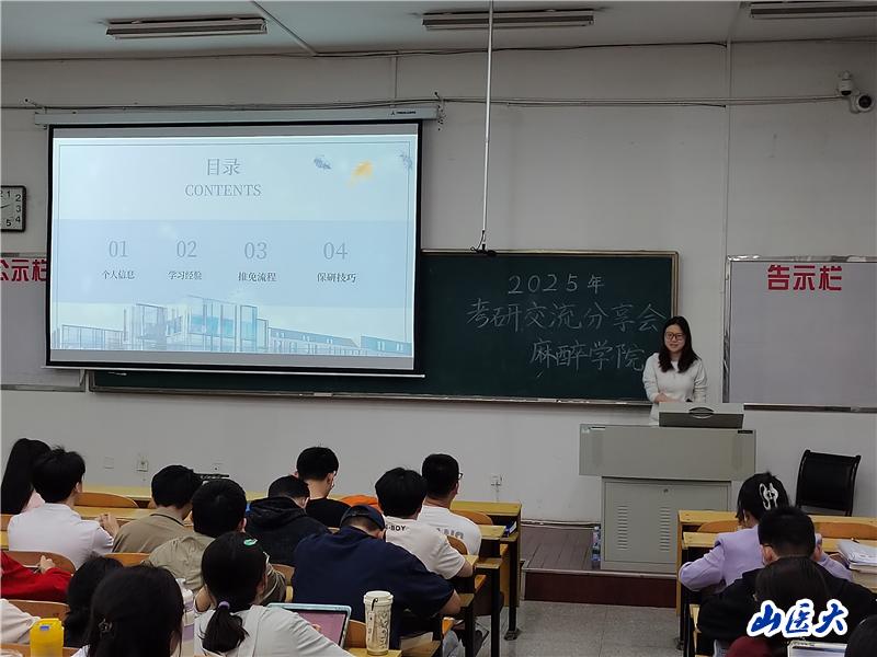 為幫助麻醉學(xué)專業(yè)學(xué)生明確考研目標(biāo)、掌握備考方法,4月25日晚上,麻醉學(xué)院在迎澤校區(qū)舉辦了2025年考研經(jīng)驗交流會。2021級全體本科生及2022級全體本科生和2020 級已考取高校碩士研究生的學(xué)生代表參加交流會,思想政治輔導(dǎo)員李佳潔主持。