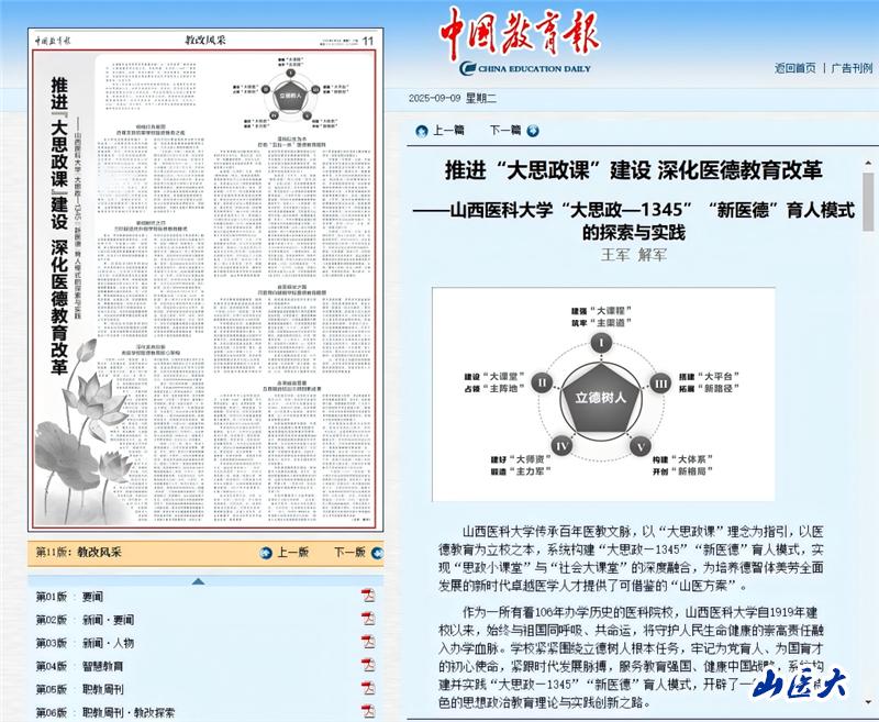 9月9日,《中國(guó)教育報(bào)》“教改風(fēng)采”版刊發(fā)我校黨委書記王軍、校長(zhǎng)解軍的署名文章《推進(jìn)“大思政課”建設(shè) 深化醫(yī)德教育改革——c7c7.app“大思政—1345”“新醫(yī)德”育人模式的探索與實(shí)踐》。文章從“根植紅色基因 百年文脈筑牢學(xué)校醫(yī)德教育之魂”“緊扣時(shí)代之問 三階段迭代升級(jí)學(xué)校醫(yī)德教育模式”“深化系統(tǒng)創(chuàng)新 夯實(shí)學(xué)校醫(yī)德教育核心架構(gòu)”“堅(jiān)持以生為本 打造‘五位一體’醫(yī)德教育矩陣”“直面現(xiàn)實(shí)之需 問題導(dǎo)向破解學(xué)校...