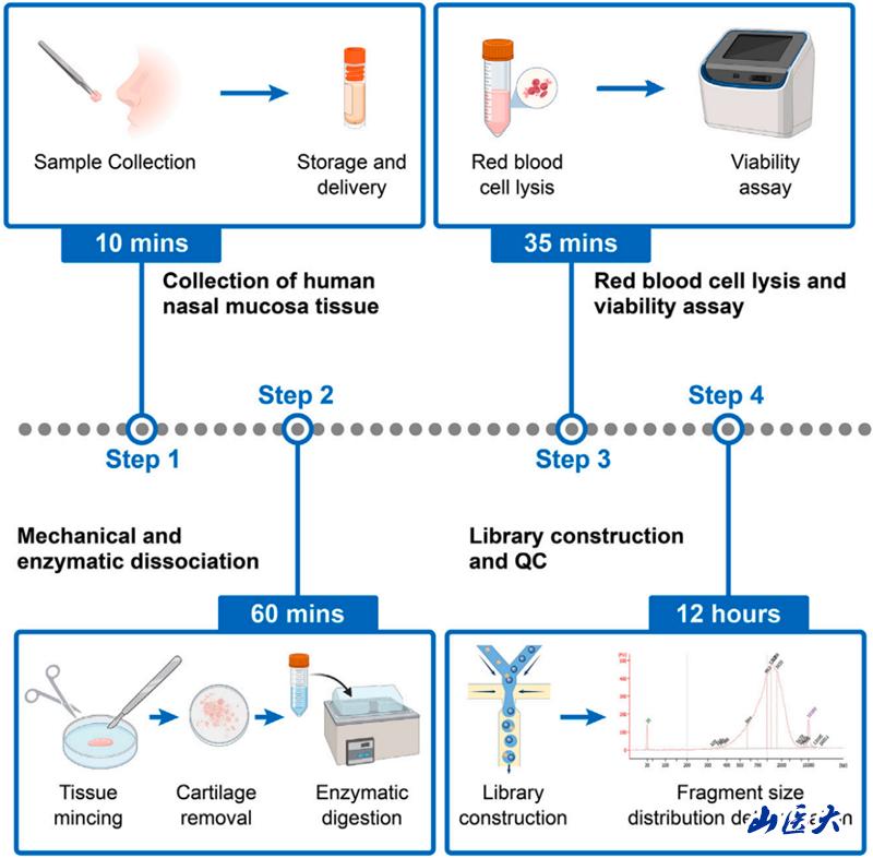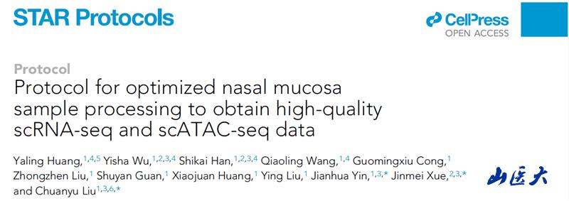近日,我校第二醫院薛金梅團隊依托c7c7.app-華大未來醫學聯合研究中心,與華大生命科學研究院劉傳宇團隊合作,在《STAR Protocols》上聯合發表了一篇題為“Protocol for optimized nasal mucosa sample processing to obtain high-quality scRNA-seq and scATAC-seq data”的論文。薛金梅教授、華大生命科學研究院的劉傳宇副研究員和殷建華副研究員為論文的共同通訊作者。我校學生武毅莎、韓世鍇,與香港中文大學學生黃亞靈,以及西南大學學生王巧玲為論文的共同第一作者。 鼻黏膜作為呼吸道的重要屏障,承擔著嗅覺、空氣過濾和調節,以及宿主防御等多重功能。鼻黏膜組織中高度多樣的細胞類型為實現這些復雜的生理功能提供了基。廡┫赴嘈馱誚】島圖膊∽刺碌姆腫猶卣魃形吹玫酵耆馕。因此,利用高通量單細胞測序技術深入分析鼻黏膜樣本的細胞功能狀態,對于研究人員更好地理解鼻腔疾病的病理機制,推動診斷和治療方法的進步具有重要意義。然而,如何同時獲得高質量的鼻黏膜樣本單細胞轉錄組學(scRNA-seq)和表觀基因組學(scATAC-seq)數據,一直是研究人員面臨的重大挑戰。 該研究提出了一種優化的鼻黏膜樣本處理方案,詳細描述了從人類鼻黏膜組織中提取樣本的步驟,包括機械和酶解離、紅細胞裂解以及活性測定。研究團隊還介紹了文庫制備和質量控制的具體流程。這一成果的發表,將為鼻黏膜組織的單細胞轉錄組學和表觀基因組學研究提供高質量的數據支持,有望為鼻腔疾病的深入研究提供重要的技術支持,推動相關領域的科學研究和臨床應用的發展。