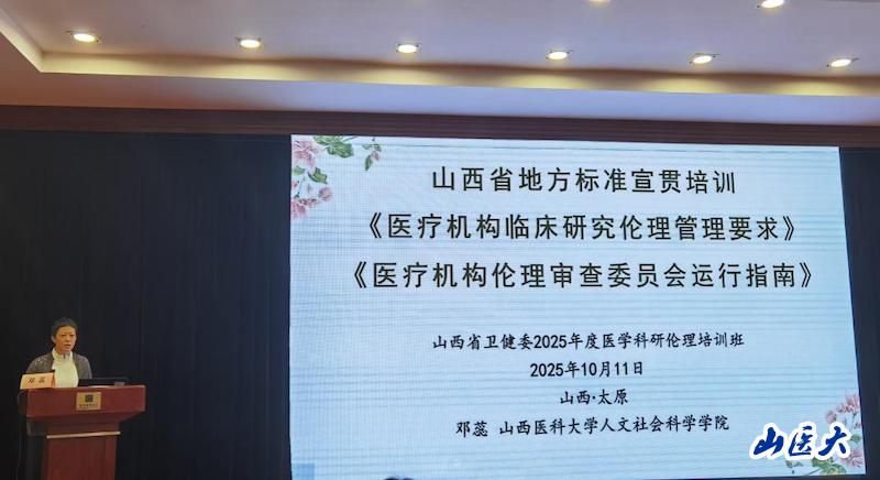 兩項(xiàng)地方標(biāo)準(zhǔn)發(fā)布后,學(xué)校積極參與宣貫工作。在山西省2025年度醫(yī)學(xué)科研倫理培訓(xùn)班上,鄧蕊教授面向省內(nèi)外200余位倫理委員會(huì)委員及醫(yī)護(hù)人員對(duì)兩項(xiàng)標(biāo)準(zhǔn)進(jìn)行了解讀,就臨床科研工作者常遇到的倫理問(wèn)題、倫理難題現(xiàn)場(chǎng)解答,進(jìn)一步推進(jìn)了我省醫(yī)學(xué)科研倫理工作規(guī)范發(fā)展。