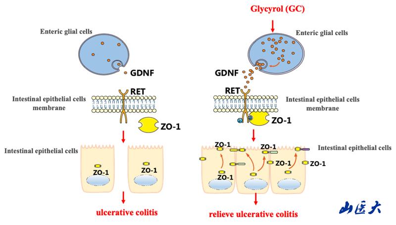 潰瘍性結(jié)腸炎(UC)因其病程長、癌變檢出率高、并發(fā)癥多,且呈現(xiàn)出年輕化、反復發(fā)作、遷延不愈等特點,被稱為“綠色癌癥”。最新數(shù)據(jù)顯示,中國有229.6萬人患有UC,且發(fā)病率逐年持續(xù)增加。然而,目前UC仍缺乏徹底治愈的醫(yī)療手段,緩解UC患者的腸道“痛點”,改善其健康狀況,是備受患者、家屬、醫(yī)生乃至科研人員關注的難點問題。UC的發(fā)病與多種因素緊密相關,本研究聚焦腸粘膜機械屏障,從“腸膠質(zhì)細胞調(diào)控腸上皮細胞”的新視角,提出“甘草酚通過促進腸膠質(zhì)細胞GDNF產(chǎn)生,激活GDNF/RET途徑,促進ZO-1與細胞膜融合,保護腸粘膜機械屏障,緩解UC”的科學假說,為UC的防治提供新思路,拓展了保護腸粘膜機械屏障的現(xiàn)有途徑。