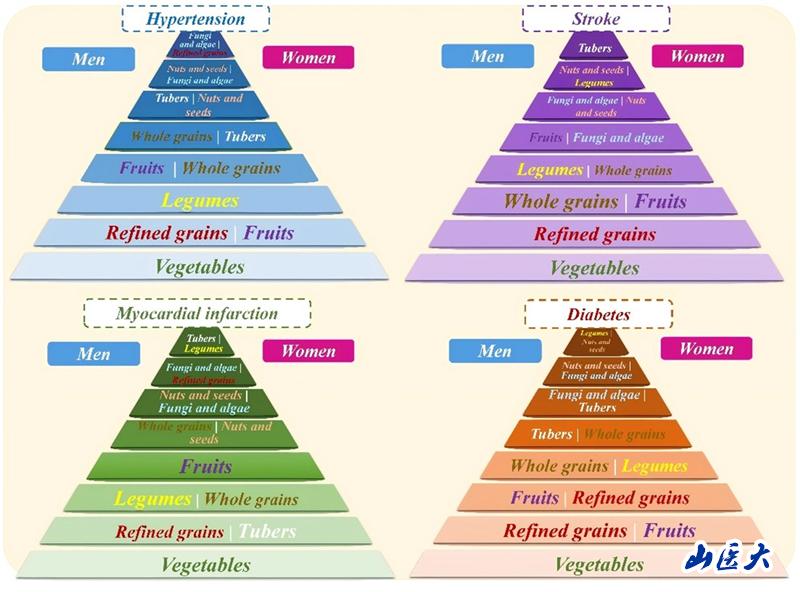 近日,我校煤炭環境致病與防治教育部重點實驗室在中國科學院1區期刊npj Science of Food雜志發表高水平論文《Utilization of Plant-Based Foods for Effective Prevention of Chronic Diseases: A Longitudinal Cohort Study》,公共衛生學院衛生統計學教研室青年教師梁潔副教授為第一作者,王彤教授為通訊作者。 慢性。乇鶚切難薌膊『吞悄蠆。鉤閃巳蚪】檔鬧卮蟾旱,且飲食因素對這些慢性病的發生與發展有重要影響。以往研究表明,地中海飲食以及植物性飲食(如水果、蔬菜、堅果和全谷物)可顯著降低心血管疾病的發病風險。盡管植物性飲食的健康益處已被廣泛認可,現有縱向研究中關于飲食與慢性病發病風險的時不變和線性關聯假設,可能導致對二者關系的估計偏差。此外,多病共存和性別差異往往被忽視,這限制了飲食建議的個體化和全面性。本研究利用中國健康與營養調查數據,結合縱向研究中時變混雜控制的方法,評估植物性食物攝入與四種慢性。ǜ哐、腦卒中、心梗、糖尿。┓⒉》縵罩淶某て諂驕亮-反應關系及其性別差異,構建了與慢性病預防相關的植物性食物飲食金字塔(圖一),發現不論男性女性,食用富含蔬菜、全谷物、水果、真菌和藻類的飲食可同時降低四種慢性病的患病風險;而男性可以適度地攝入精制谷物;女性應增加堅果和種子的攝入量,以降低慢性疾病的發病風險。該研究結論為制定更精準的慢性病預防策略提供依據。