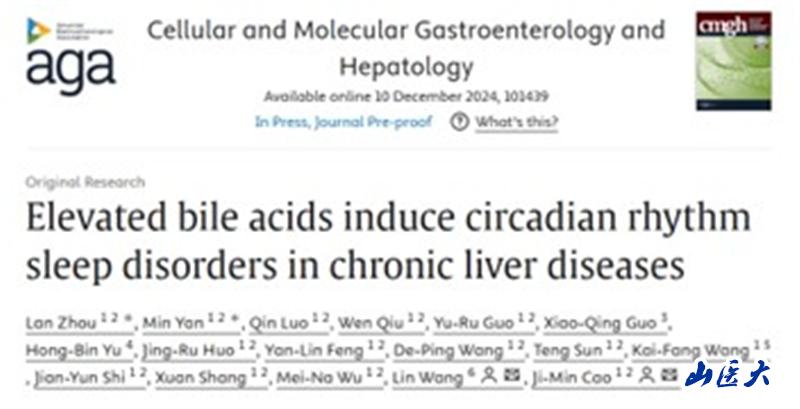 近日,我校細胞生理學教育部重點實驗室曹濟民教授團隊在《Cellular and Molecular Gastroenterology and Hepatology》(中國科學院一區(qū)期刊)發(fā)表了題為“Elevated bile acids induce circadian rhythm sleep disorders in chronic liver diseases”的研究論文(DOI:10.1016/j.jcmgh.2024.101439),周嵐副教授和博士生閆敏為共同第一作者,曹濟民教授為主通訊作者。