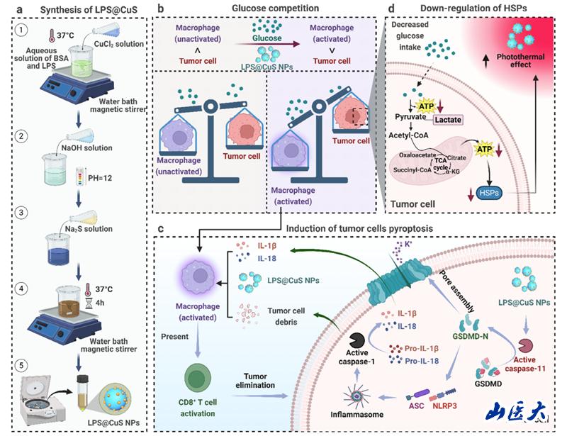 腫瘤微環(huán)境中,腫瘤細(xì)胞與免疫細(xì)胞間的營(yíng)養(yǎng)競(jìng)爭(zhēng)異常激烈,腫瘤細(xì)胞通過(guò)代謝重編程掠奪葡萄糖資源,導(dǎo)致免疫細(xì)胞能量供給受限,嚴(yán)重削弱其抗腫瘤活性。此外,傳統(tǒng)光熱療法雖可殺傷腫瘤,但腫瘤細(xì)胞可通過(guò)有效的營(yíng)養(yǎng)攝取來(lái)上調(diào)熱休克蛋白(HSPs)的表達(dá),從而對(duì)熱應(yīng)激產(chǎn)生耐受性,降低光熱治療的敏感性。因此,研究團(tuán)隊(duì)創(chuàng)新性設(shè)計(jì)了一種半人工細(xì)菌焦亡誘導(dǎo)劑(SBP),用于逆轉(zhuǎn)腫瘤微環(huán)境的代謝重編程。這種SBP基于硫化銅(CuS)和細(xì)菌細(xì)胞壁主要成分脂多糖(LPS)構(gòu)建,通過(guò)仿生礦化獲得具有類(lèi)細(xì)菌免疫刺激特性與光熱消融功能的納米顆粒(LPS@CuS SBP),實(shí)現(xiàn)代謝干預(yù)與免疫激活的雙重功能。