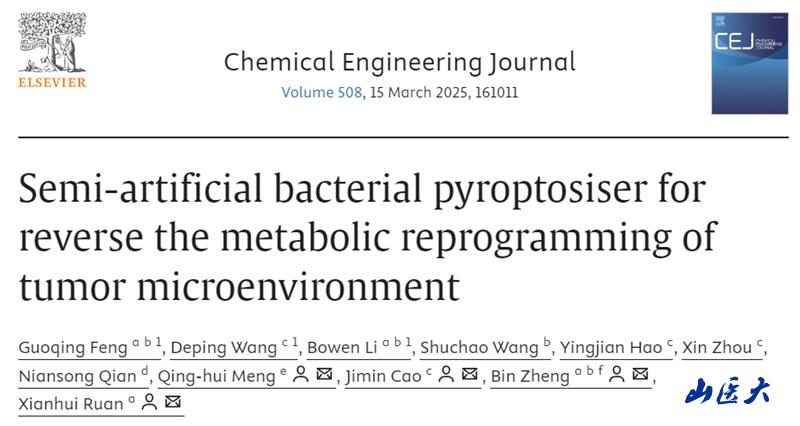 3月15日,細(xì)胞生理學(xué)教育部重點(diǎn)實(shí)驗(yàn)室曹濟(jì)民教授團(tuán)隊(duì)在國(guó)際權(quán)威期刊《Chemical Engineering Journal》(中國(guó)科學(xué)院一區(qū)TOP期刊,影響因子13.3)發(fā)表題為《Semi-artificial bacterial pyroptosiser for reverse the metabolic reprogramming of tumor microenvironment》的合作研究成果。我校王德平教授為共同第一作者,我校曹濟(jì)民教授、天津醫(yī)科大學(xué)鄭斌教授及阮先輝教授為共同通訊作者,我校周鑫教授和碩士生郝英健為共同作者。