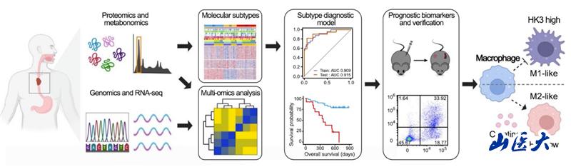 研究人員通過對ESCC的代謝組學和蛋白質組學分析,詳細描繪了ESCC中的蛋白-代謝景觀,并結合先前的基因組和轉錄組數據,豐富了ESCC的分子特征。進一步基于蛋白質組學和代謝組學鑒定出三個代謝-免疫特征顯著差異的亞型(S1、S2和S3),并開發了亞型預測模型。S3亞型表現出最差的預后,其免疫微環境顯著抑制,表現為M2型腫瘤相關巨噬細胞(TAMs)浸潤增加,而CD8+T細胞、CD4+T細胞和NK細胞浸潤減少。肌酸累積和己糖激酶3(HK3)蛋白表達降低是S3型的兩個特征。研究人員隨后通過動物實驗和細胞實驗發現,肌酸累積與HK3降低可能介導一種能量轉化,二者通過重編程TAMs的能量代謝,協同驅動TAMs向M2型極化,重塑ESCC免疫抑制型微環境。