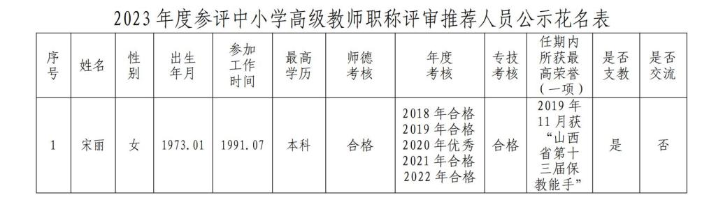 根據(jù)國家和省、市深化職稱制度改革精神,按照《太原市教育局 太原市人力資源和社會保障局關(guān)于開展2023年度市直屬中小學(xué)一級教師和市中小學(xué)高級教師職稱評審工作的通知》(并教師〔2023〕3號)安排及我校推薦工作方案,我校職稱評審?fù)扑]委員會對我校1名申報人員任現(xiàn)職以來各年度的職業(yè)道德、業(yè)績能力、出勤情況、學(xué)術(shù)成果、表彰獎勵等方面進行了全面考評,得出最終考評結(jié)果。現(xiàn)將相應(yīng)排名順序名單公示如下,歡迎全體教職工進行監(jiān)督。