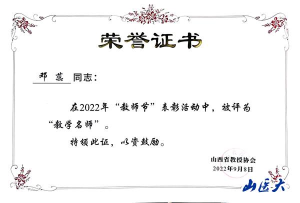 近日,山西省教授協(xié)會下發(fā)了《山西省教授協(xié)會關(guān)于教師節(jié)表彰的決定》,我校人文社會科學學院教師鄧蕊榮獲2022年度“教學名師”稱號。此次評獎,全省共評出教學名師73人,我校獲此殊榮的教師共5人。