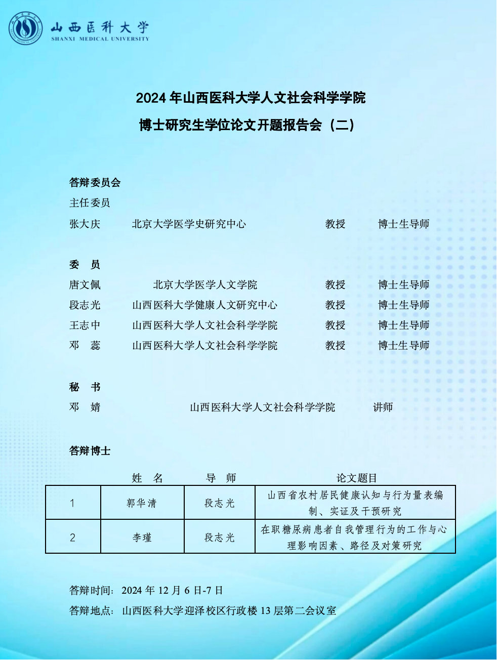 2024年人文醫(yī)學(xué)博士研究生學(xué)位論文開(kāi)題報(bào)告會(huì)(二)
