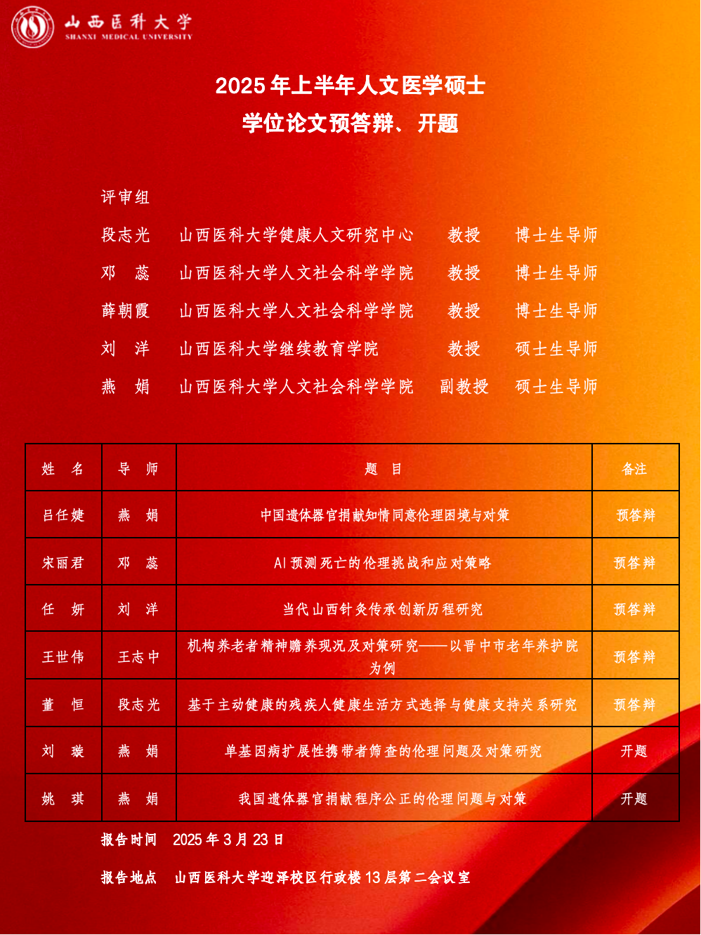 2025年上半年人文醫學碩士研究生學位論文預答辯、開題報告會
