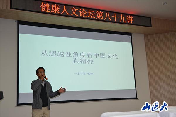 10月31日晚,中都校區基礎報告廳座無虛席,第八十九次健康人文論壇榮幸邀請到著名文化學者暢鐘先生,作了題為《從超越性角度看中國文化的真精神》的精彩演講,為全校師生送上了一道中國文化大餐。講座由人文社會科學學院黨總支書記任勝利主持。任勝利書記介紹了暢鐘先生在中國歷史與文化、歷史哲學和學術思想研究等諸多方面的成果和貢獻,對暢先生的到來表示熱烈歡迎。