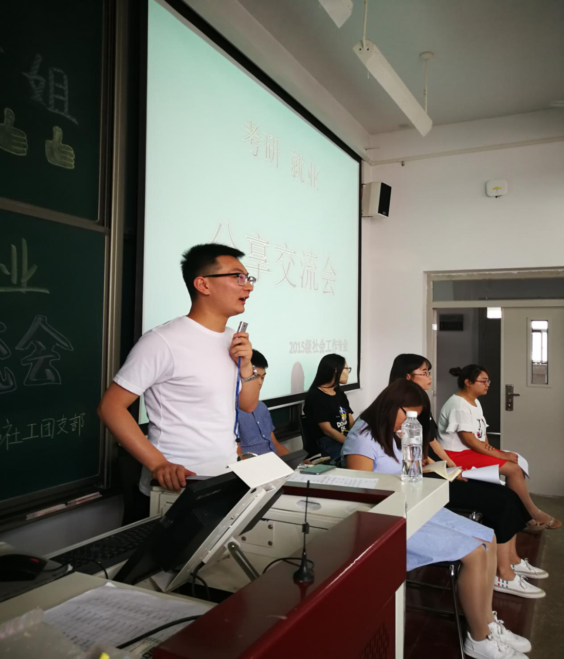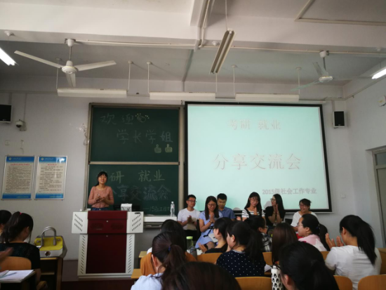2017年5月19日,由2015級(jí)社會(huì)工作專業(yè)主辦的畢業(yè)生考研、就業(yè)心得交流會(huì)在慎思A301教室舉行。本次交流會(huì)邀請(qǐng)到2013級(jí)社會(huì)工作專業(yè)6名畢業(yè)生同學(xué)為大家做了保研、考研、考公務(wù)員方面的經(jīng)驗(yàn)交流,他們分別是保研到中國(guó)社會(huì)科學(xué)院的喬志杰同學(xué)、考研到哈爾濱工業(yè)大學(xué)的喬海霞同學(xué)、考研到南開大學(xué)的陳杰同學(xué)、考研到吉林大學(xué)的范燕燕同學(xué)、在國(guó)考中考入北京市鐵路公安局的蔣劍同學(xué)、在省考中考入湖北省洪湖市國(guó)稅局的吉娜娜同學(xué)。出席本次交流會(huì)的領(lǐng)導(dǎo)老師有人文社會(huì)科學(xué)學(xué)院黨支部副書記劉曉麗、人文社會(huì)科學(xué)學(xué)院2015級(jí)社會(huì)工作專業(yè)思想政治輔導(dǎo)員劉婭老師。