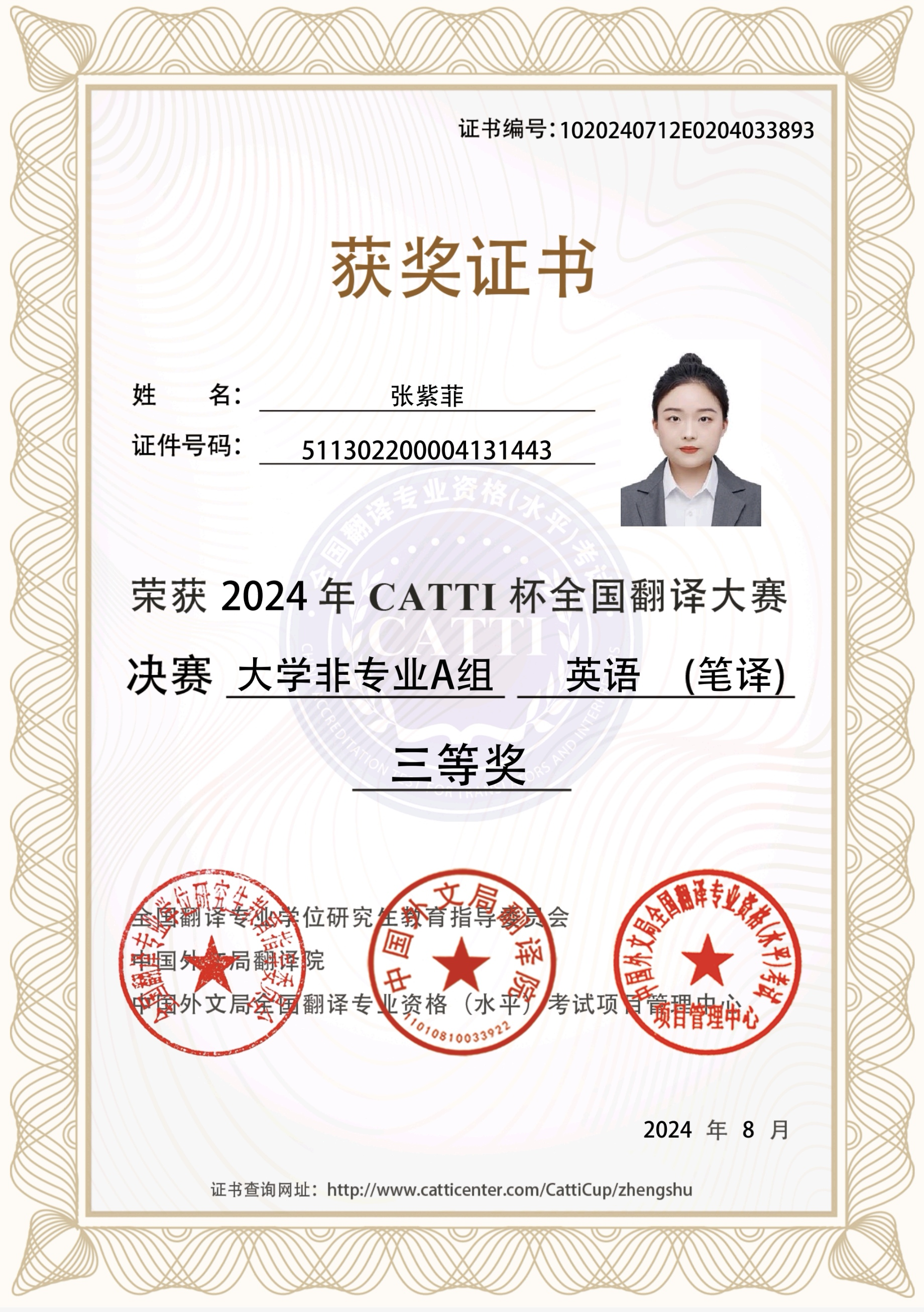 2024年8月,張紫菲獲CATTI杯全國翻譯大賽決賽大學非專業A組英語(筆譯)三等獎,由全國翻譯專業學位研究生教育指導委員會等單位頒發證書。