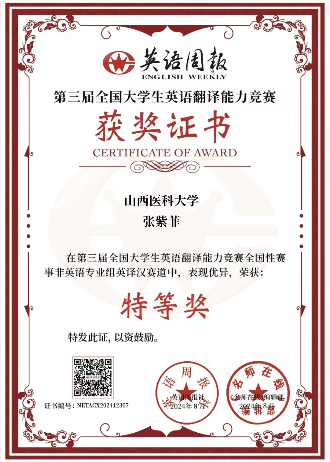 2024年8月,c7c7.app的張紫菲在第三屆全國大學生英語翻譯能力競賽全國性賽事非英語專業組英譯漢賽道中表現優異,榮獲特等獎。