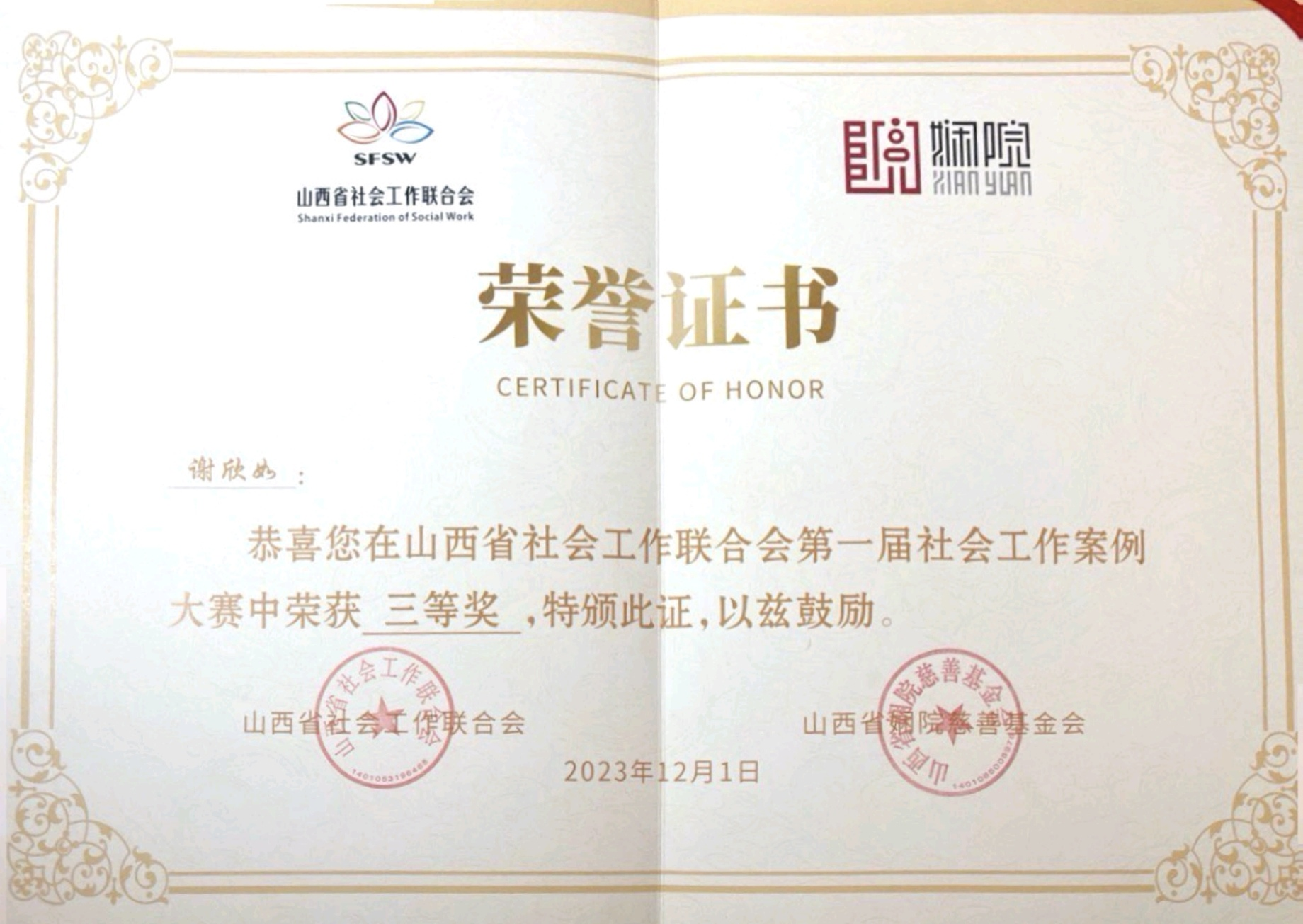 2023年 謝欣如在山西省社會工作聯合會第一屆社會工作案例大賽中獲三等獎,由山西省社會工作聯合會、山西省嫻院慈善基金會頒證。